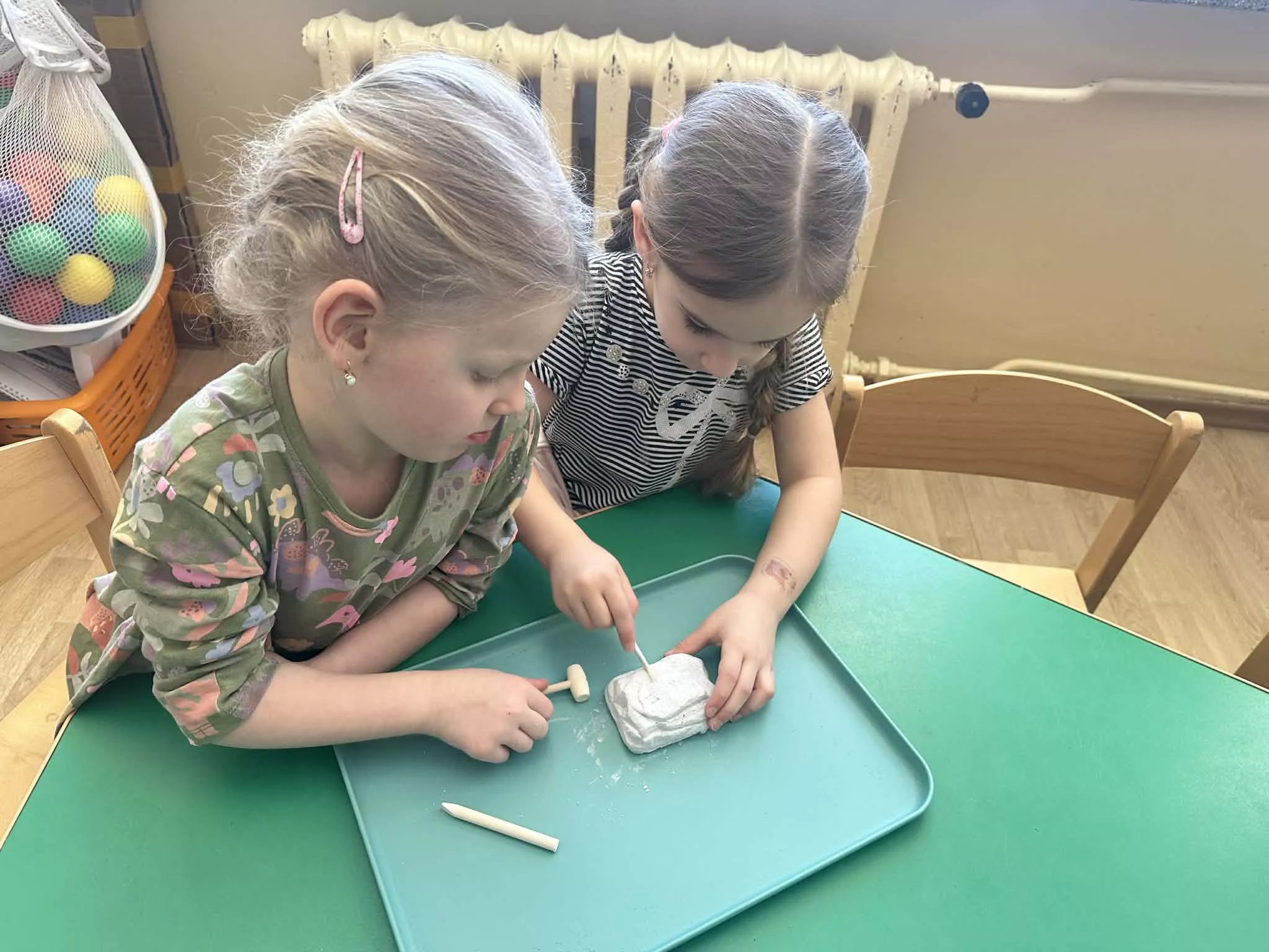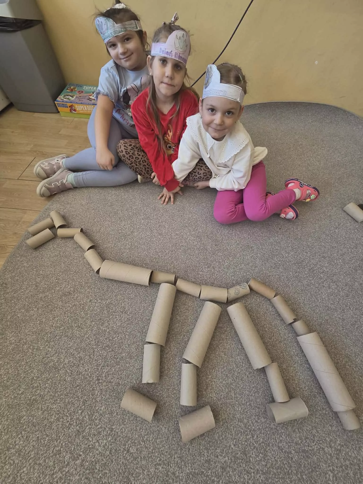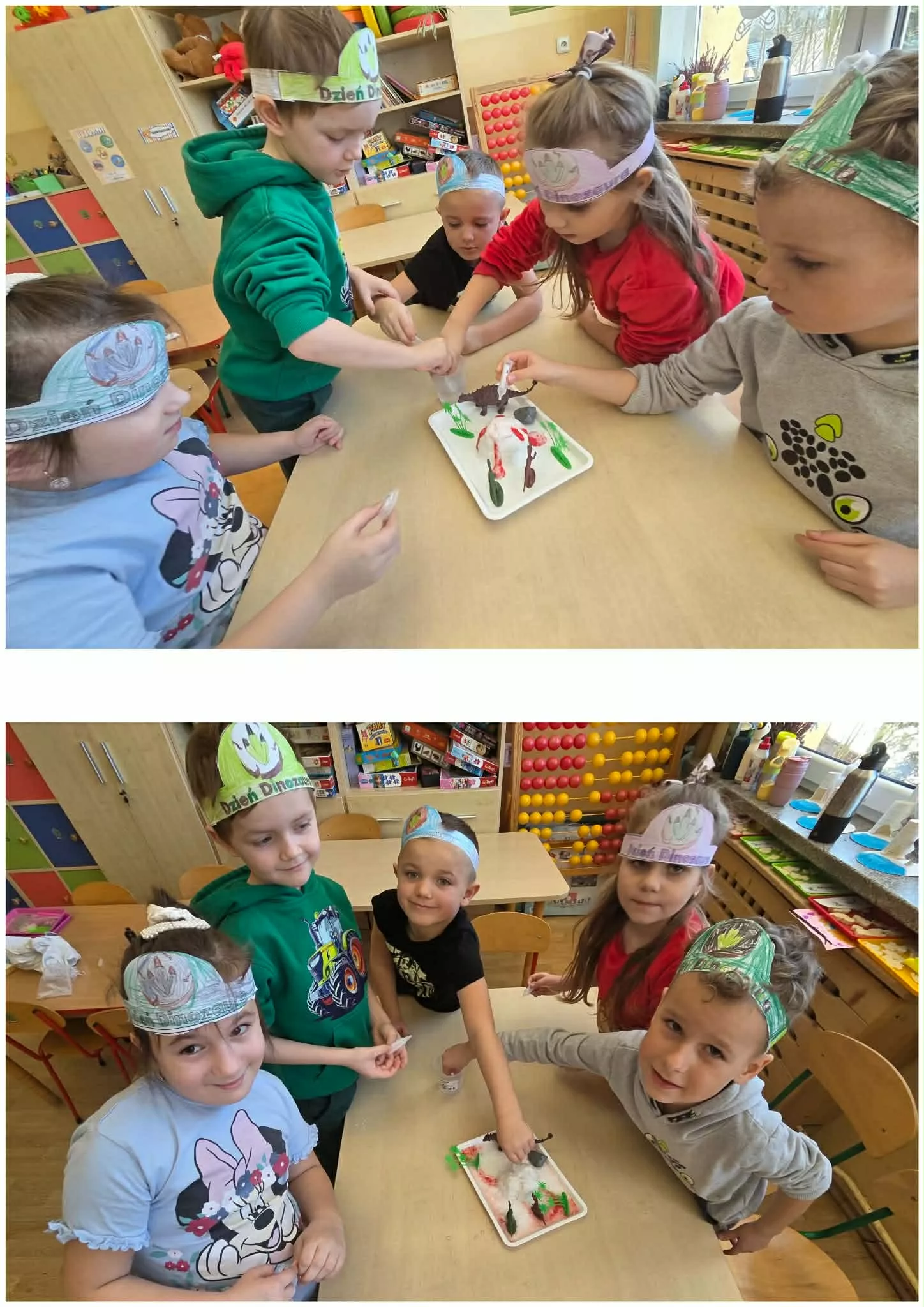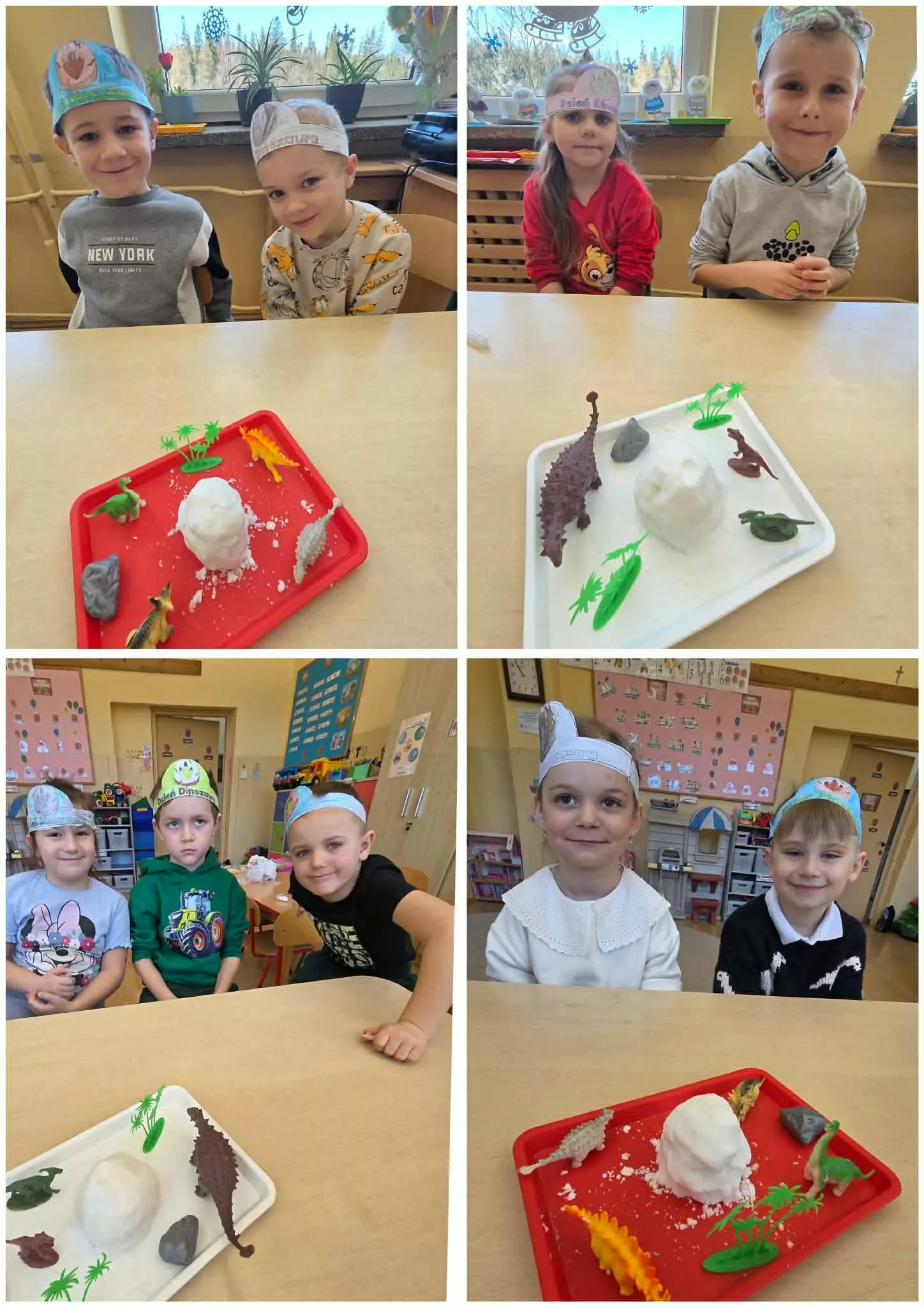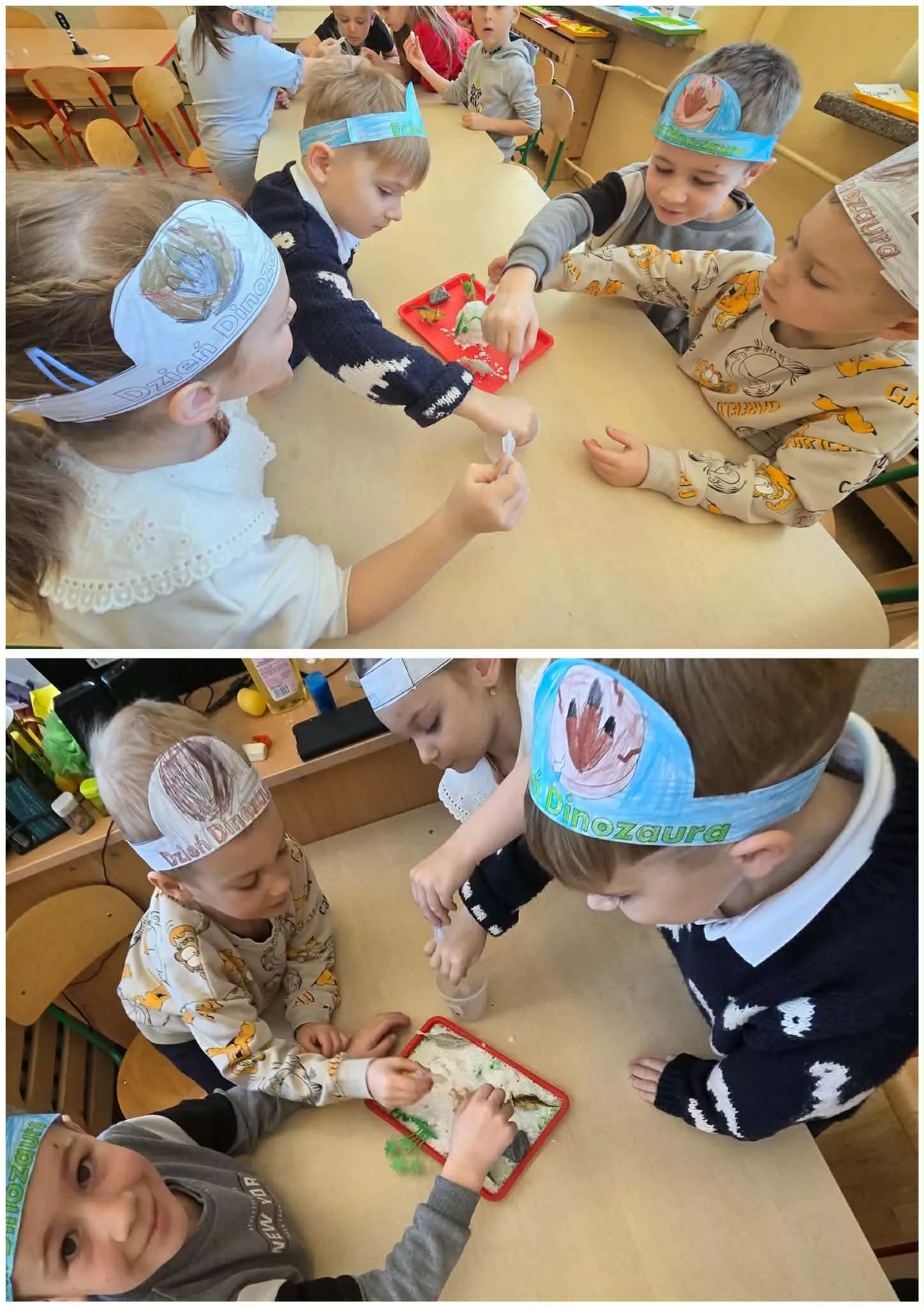 Dzieci wykonały kolorowe dinozaurowe opaski, lepiły prehistoryczne gady, przeprowadzały ciekawe eksperymenty oraz kodowały na dywanie. Nie zabrakło także zabawy w wyszukiwanie dinozaurów i dopasowywanie ich cieni. Mali odkrywcy uczyli się rozpoznawać różne gatunki dinozaurów oraz z radością zaśpiewali o nich piosenkę.