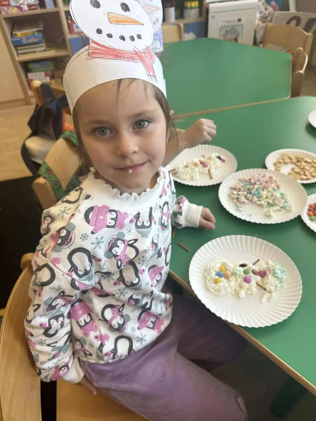 Przedszkolaki z wielkim entuzjazmem przygotowywały bałwanki z bitej śmietany, które okazały się nie tylko piękne, ale i bardzo smaczne. Podczas zabaw dzieci przeliczały guziki na śniegowych postaciach, ćwicząc swoje umiejętności matematyczne. Na zakończenie wykonały zimową pracę plastyczną, która była wspaniałym podsumowaniem tego wyjątkowego dnia.