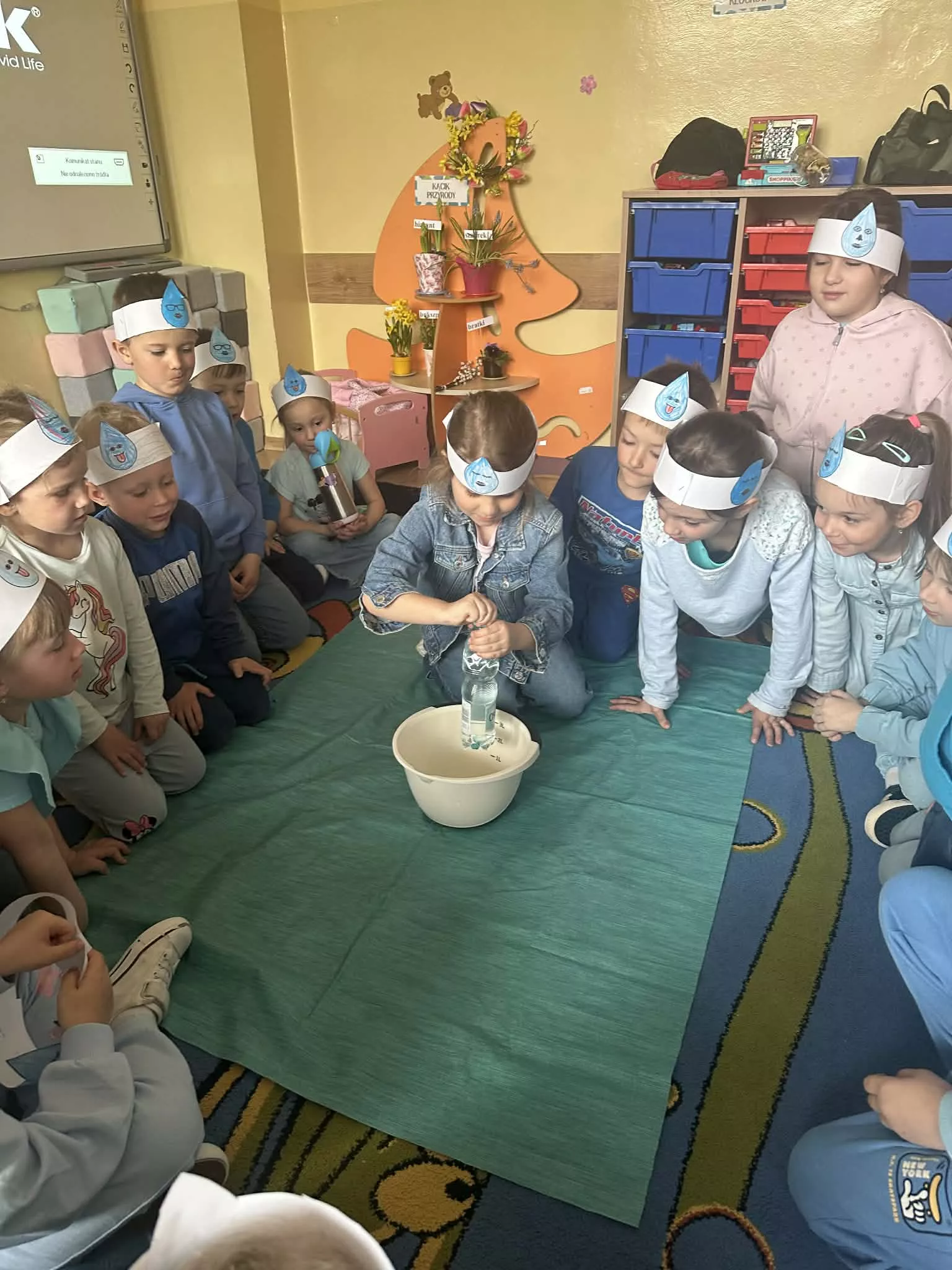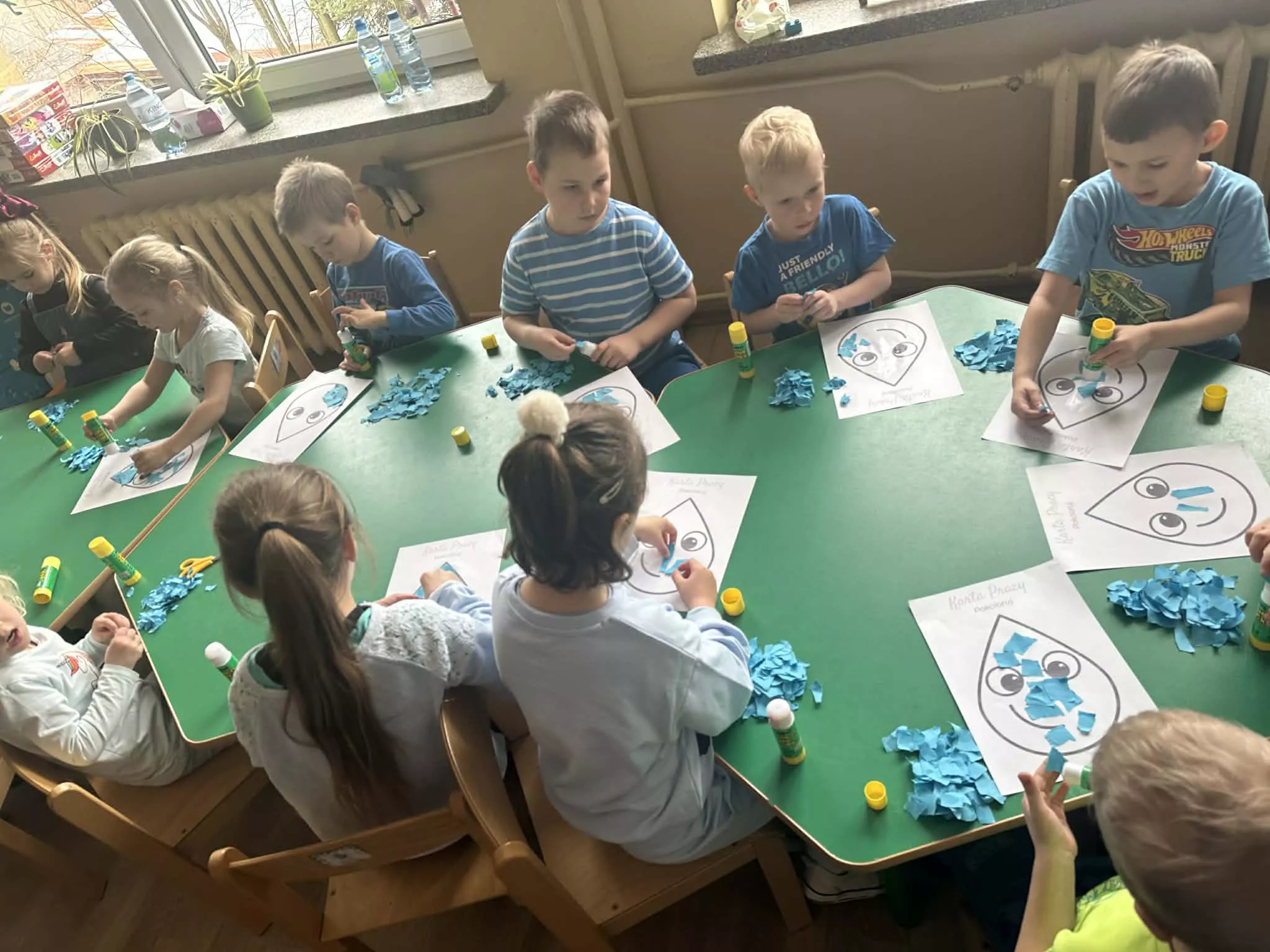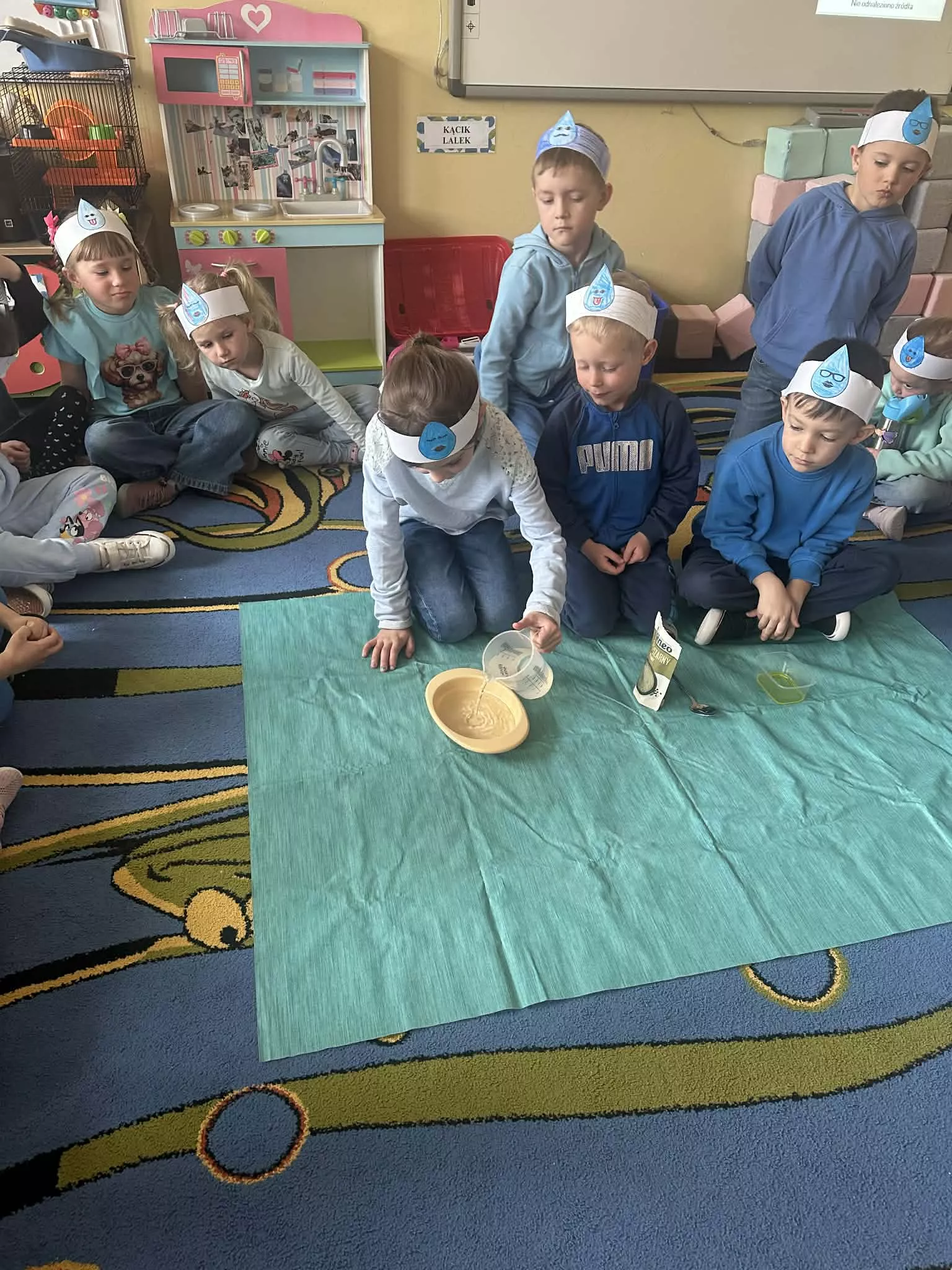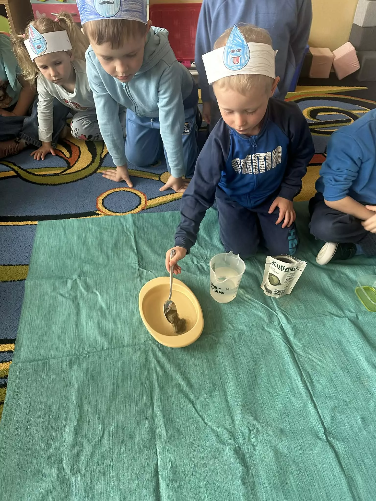 Najwięcej radości sprawiła dzieciom część doświadczalna, podczas której mogły samodzielnie eksperymentować z wodą i obserwować jej właściwości. Na zakończenie przedszkolaki wykonały pracę plastyczną – kropelkę wyklejoną kolorowym papierem, rozwijając swoją kreatywność i zdolności manualne.