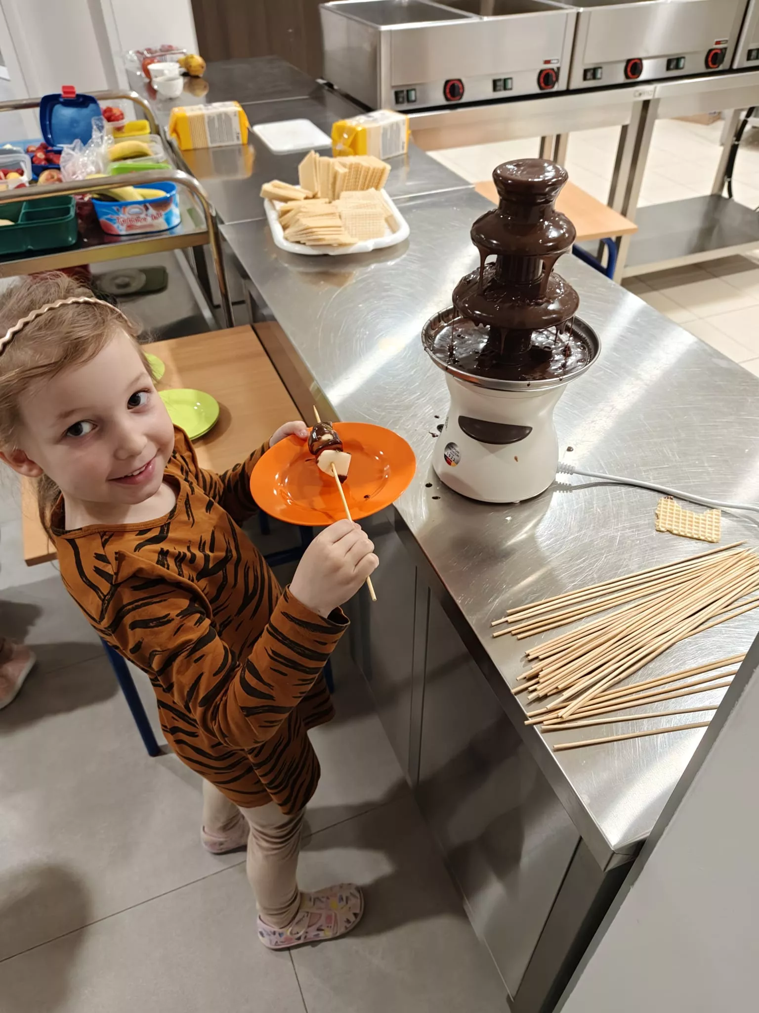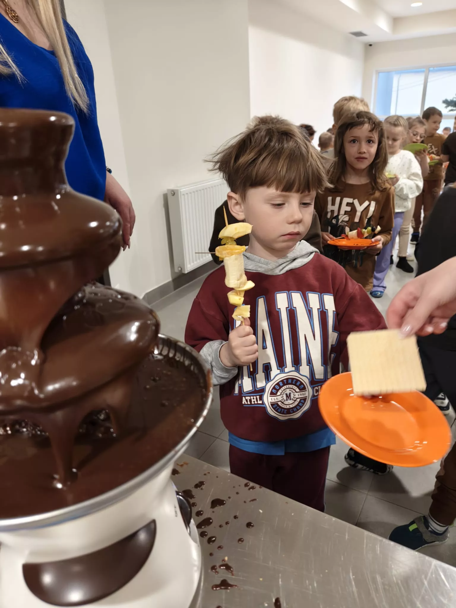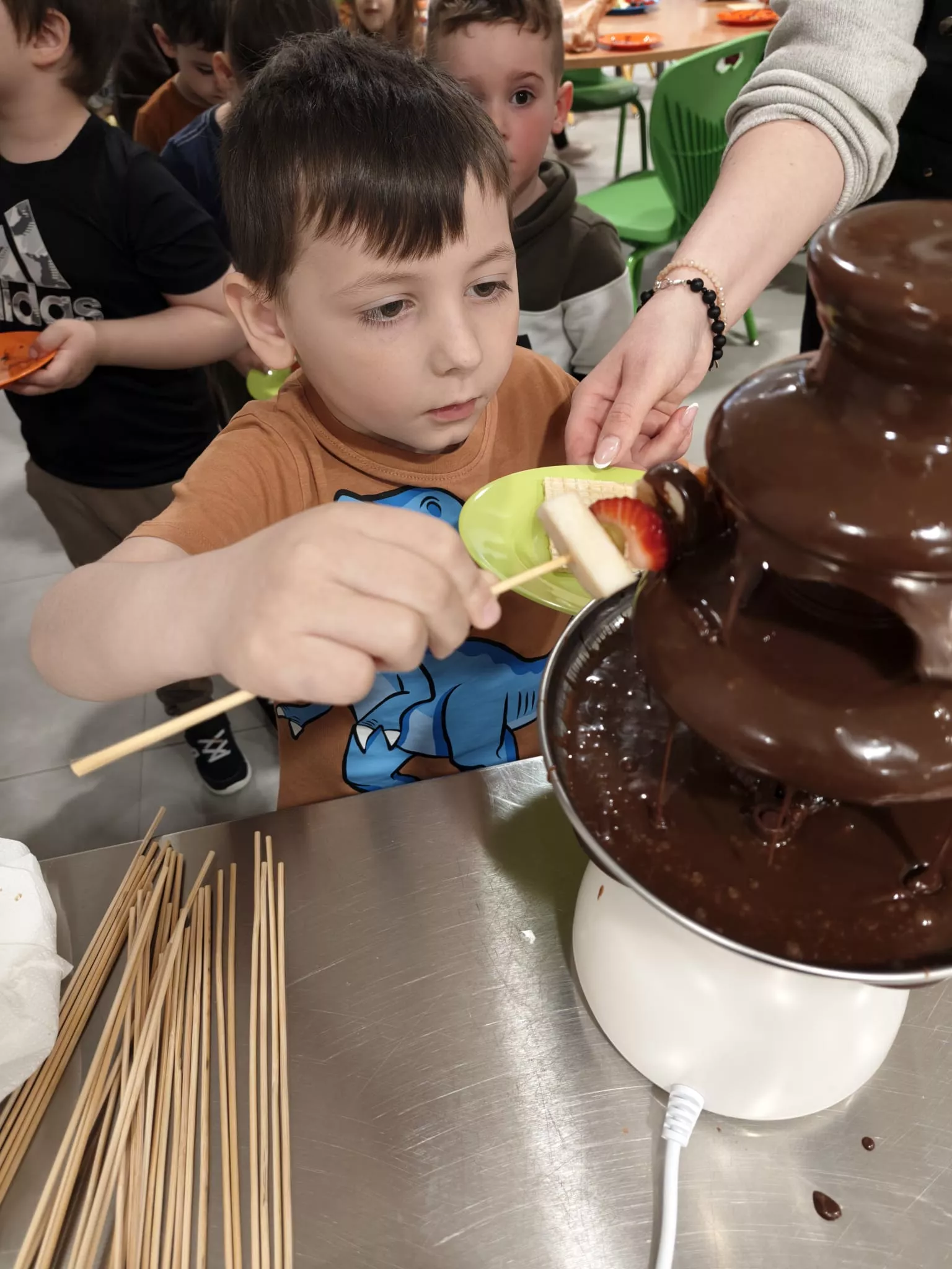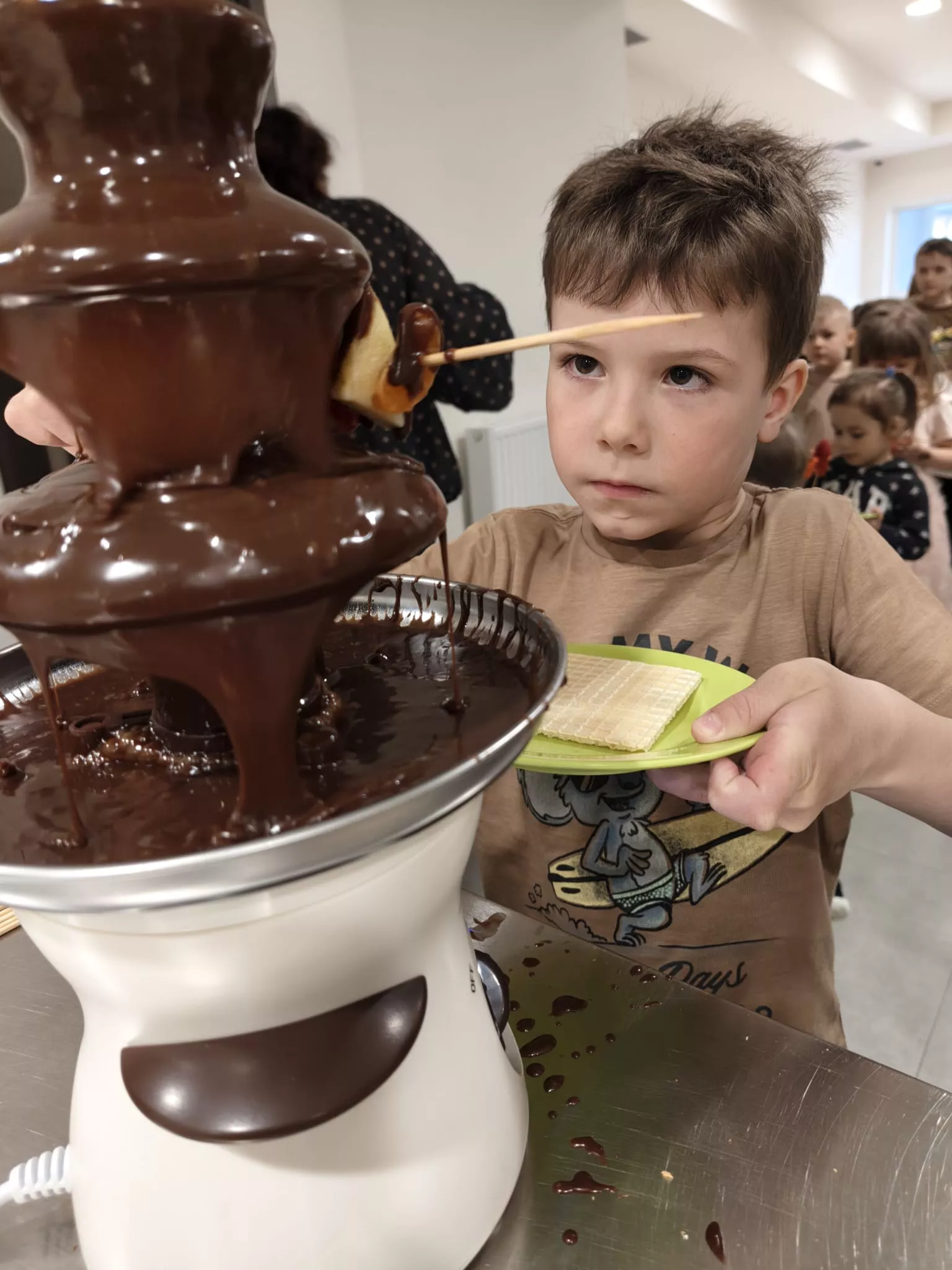 Nasze przedszkolaki w tym dniu miały okazję zobaczyć, powąchać, dotknąć, a przede wszystkim spróbować czekolady. Przedszkolaki dowiedziały się z czego powstaje ten przysmak oraz co jest jego głównym składnikiem. Zapoznały się także z procesem powstawania czekolady. Oprócz degustacji owoców zanurzonych w gorącej czekoladzie, dzieci uczestniczyły w czekoladowych zabawach. Na koniec wykonały czekoladowe kolorowanki i książeczki edukacyjne dotyczące powstawania tego rarytasu.
