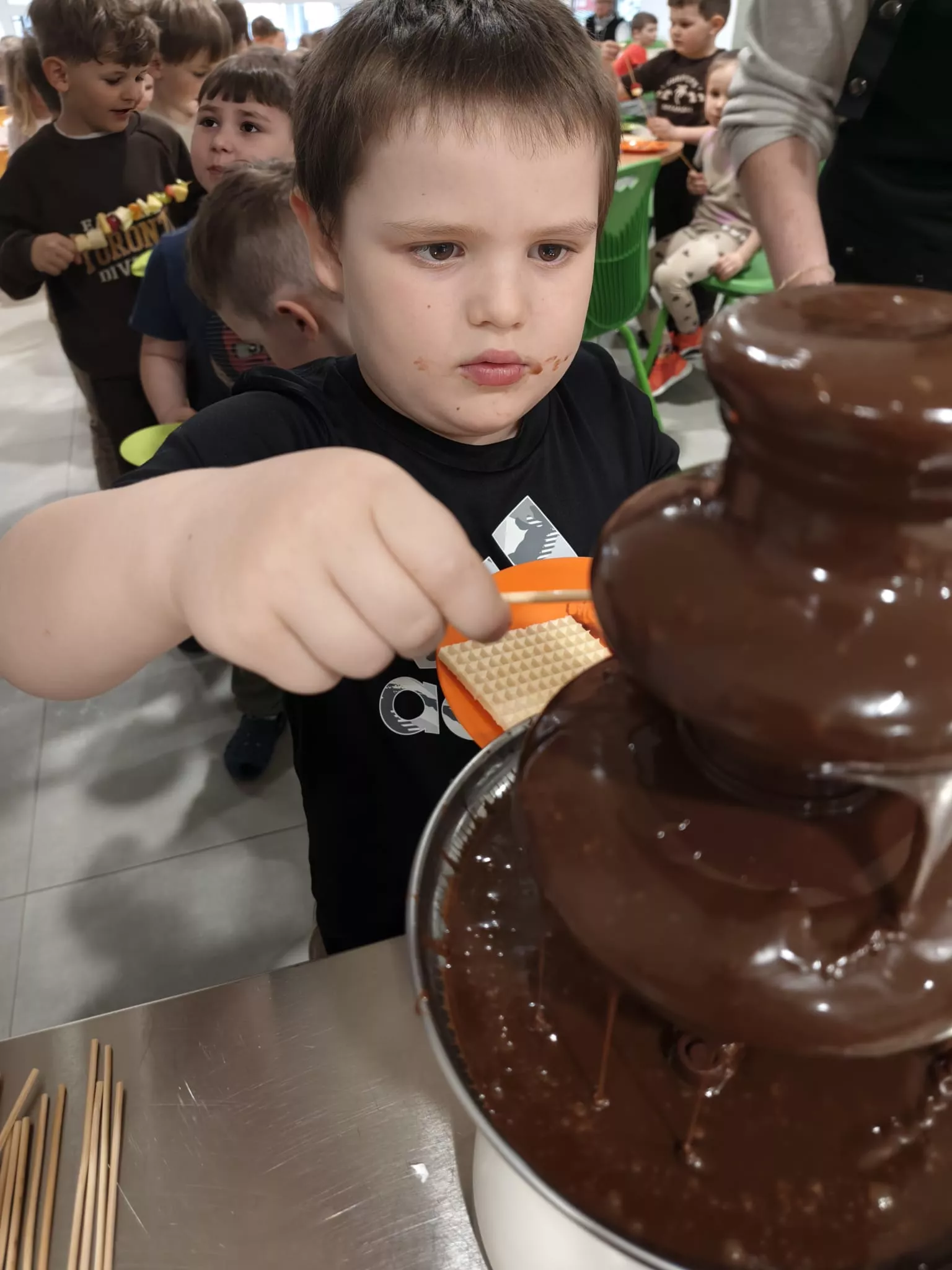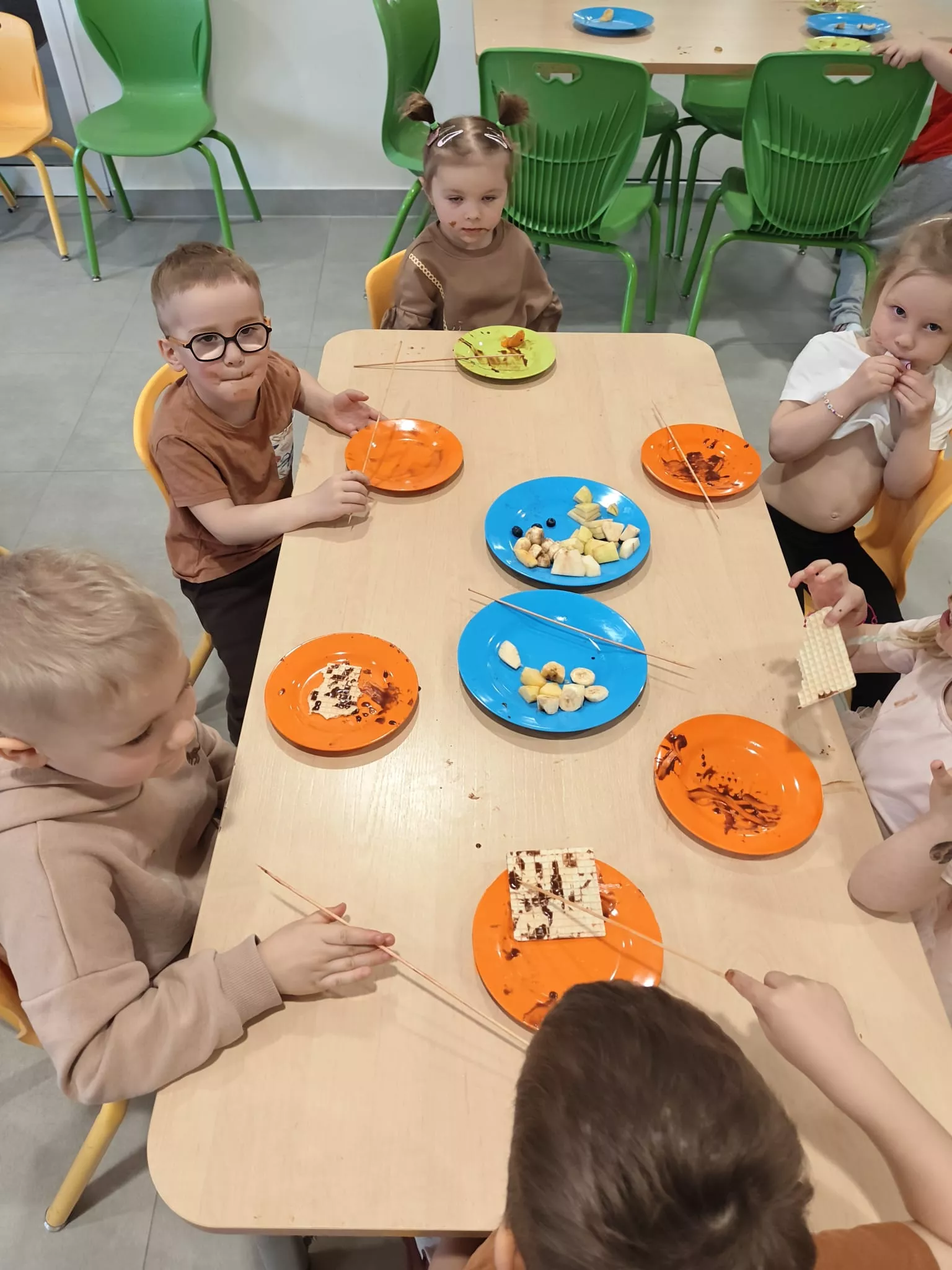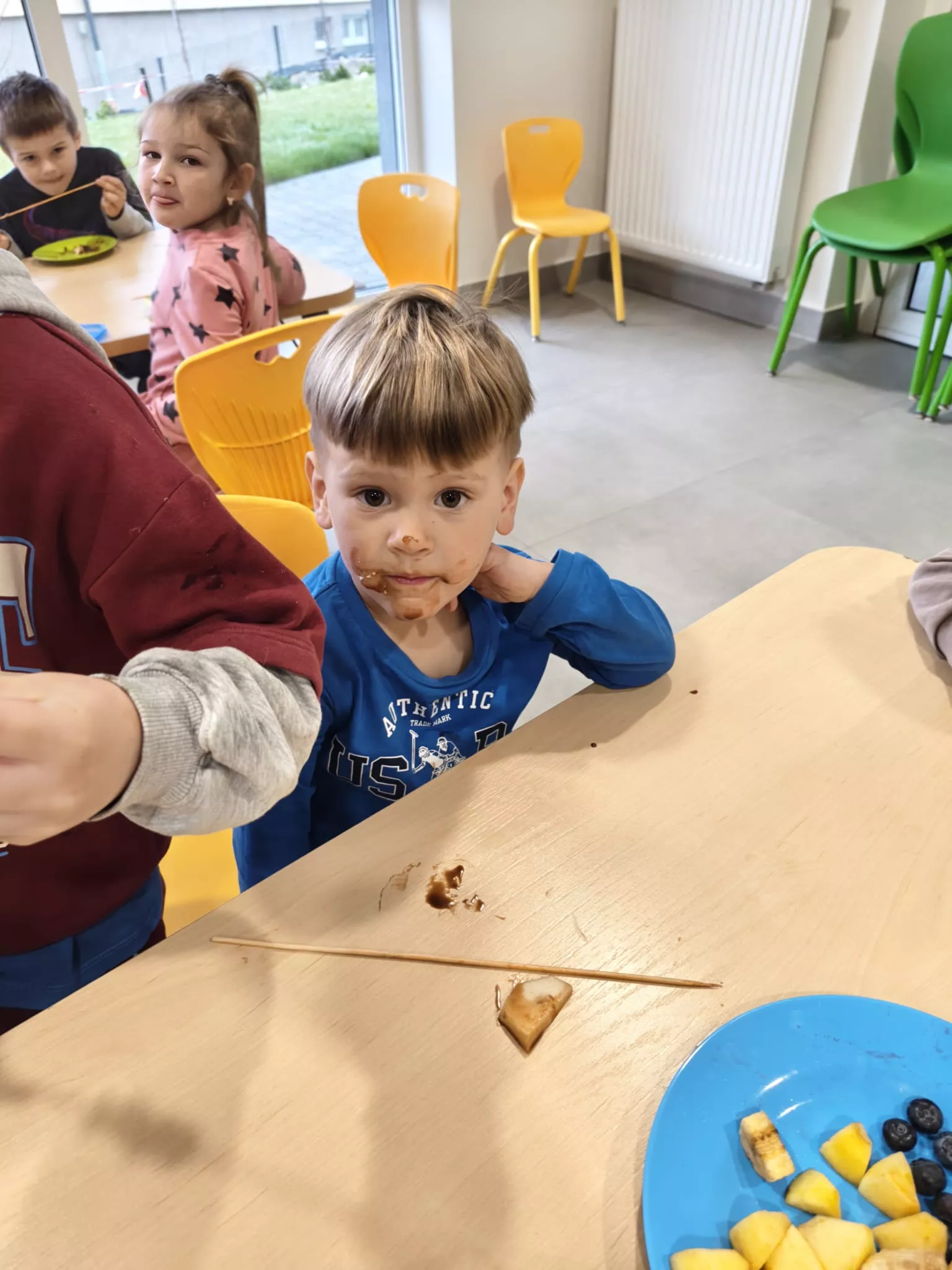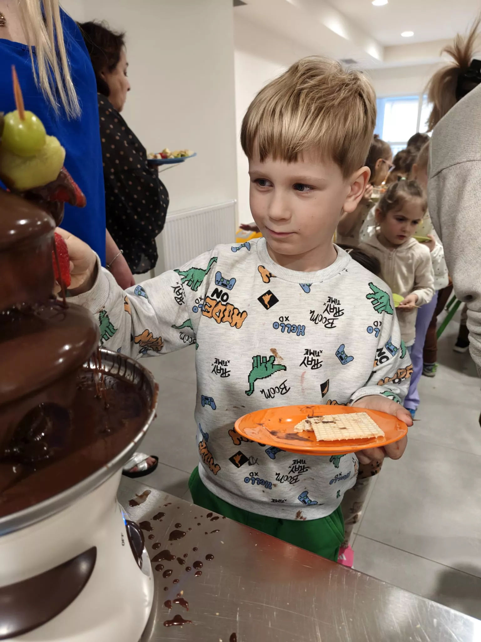 Nasze przedszkolaki w tym dniu miały okazję zobaczyć, powąchać, dotknąć, a przede wszystkim spróbować czekolady. Przedszkolaki dowiedziały się z czego powstaje ten przysmak oraz co jest jego głównym składnikiem. Zapoznały się także z procesem powstawania czekolady. Oprócz degustacji owoców zanurzonych w gorącej czekoladzie, dzieci uczestniczyły w czekoladowych zabawach. Na koniec wykonały czekoladowe kolorowanki i książeczki edukacyjne dotyczące powstawania tego rarytasu.