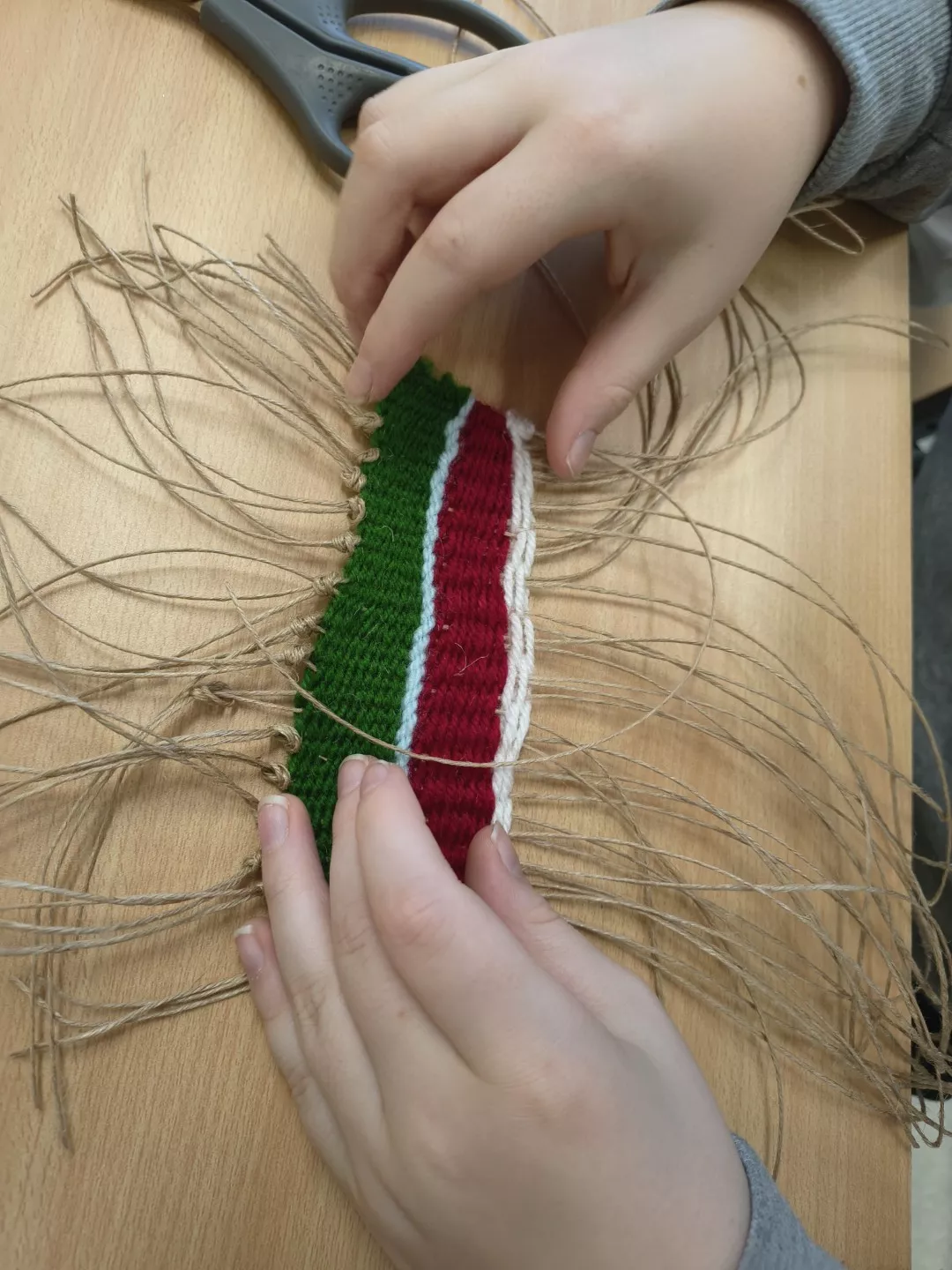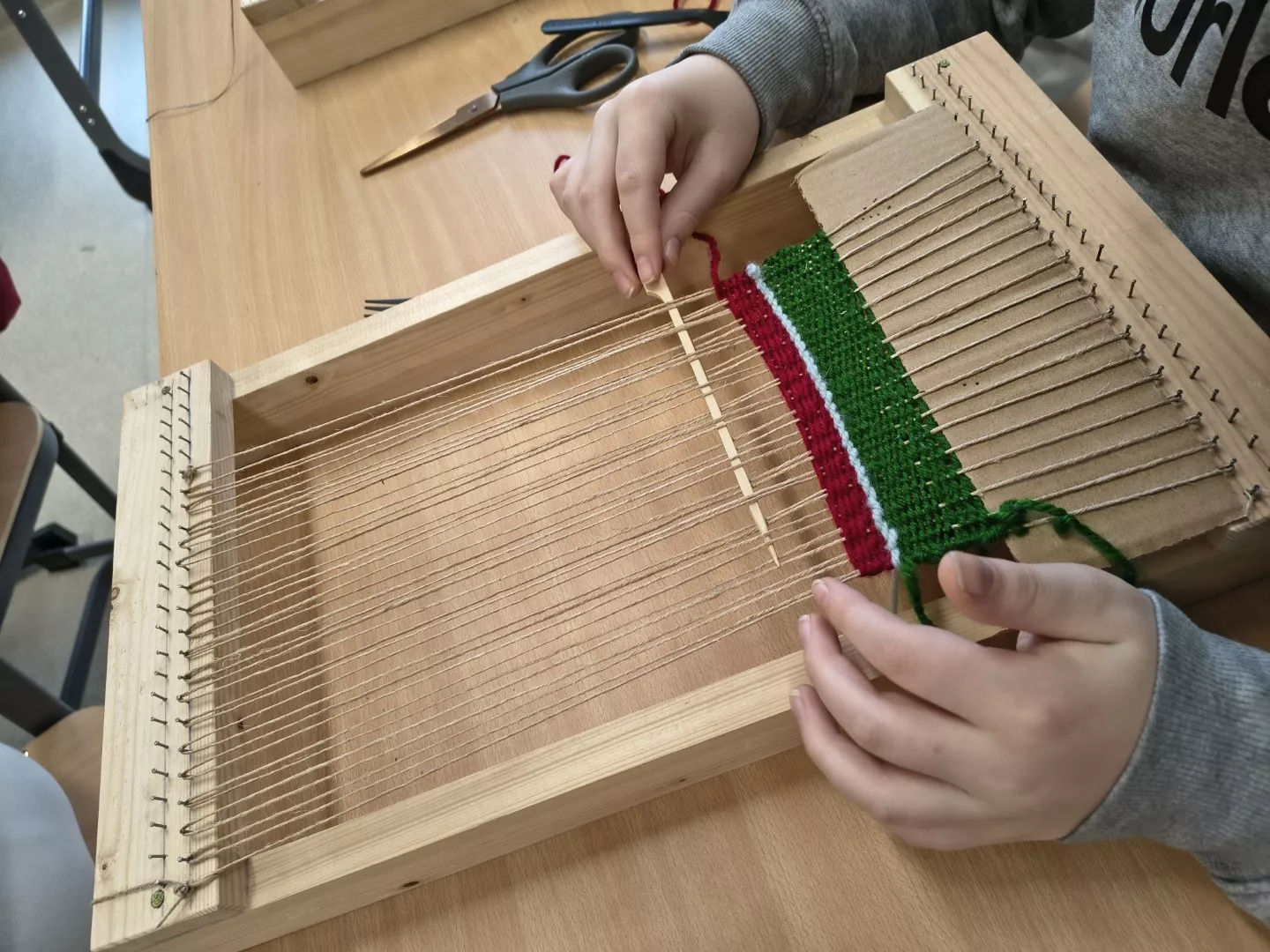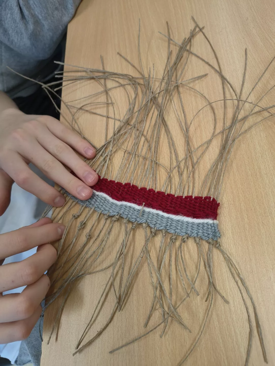 Podczas zajęć rozwijających uzdolnienia artystyczne w kl. 7a uczniowie mogli spróbować swoich sił w tkactwie własnoręcznie wykonując małą tkaninę. Zadanie wymagało skupienia, by nie przeoczyć żadnej nitki osnowy i utrzymać rytm biegnącego wątku. Nie było to łatwe. I pomyśleć, że nasze babcie i prababcie potrafiły utkać na wielkim krośnie tkackim długie chodniki oraz gęste lniane płótno, z którego później szyto np. koszule...