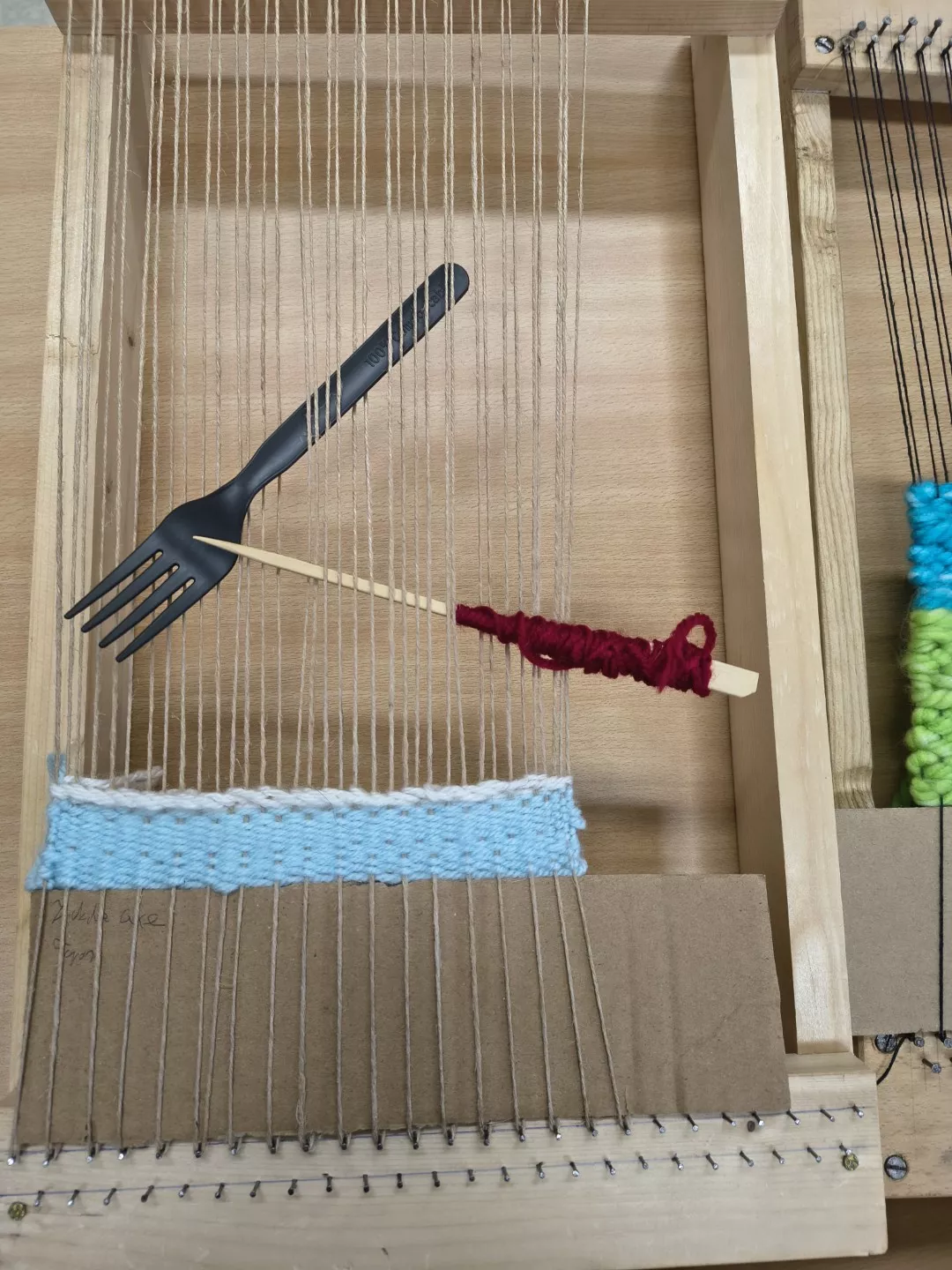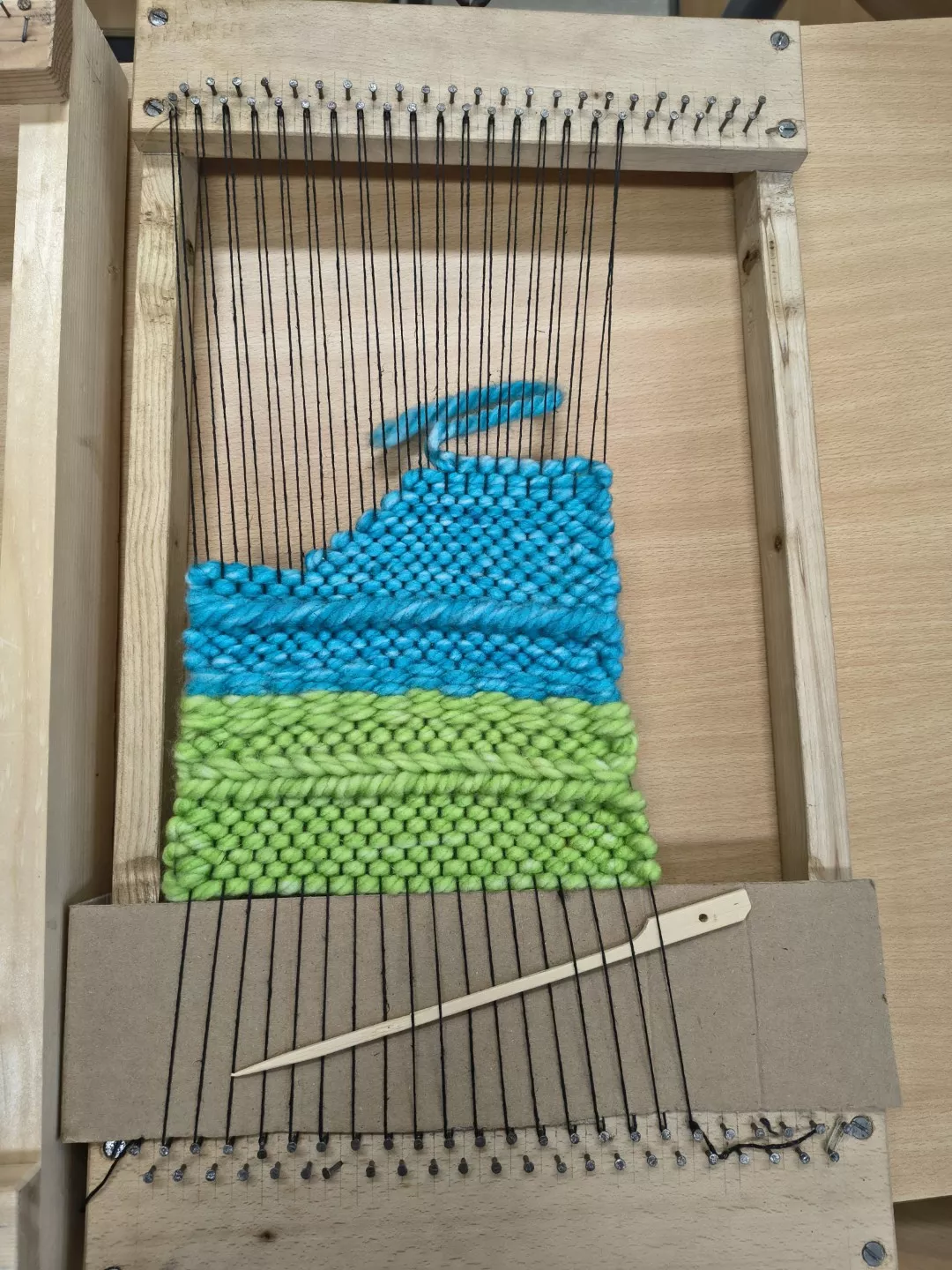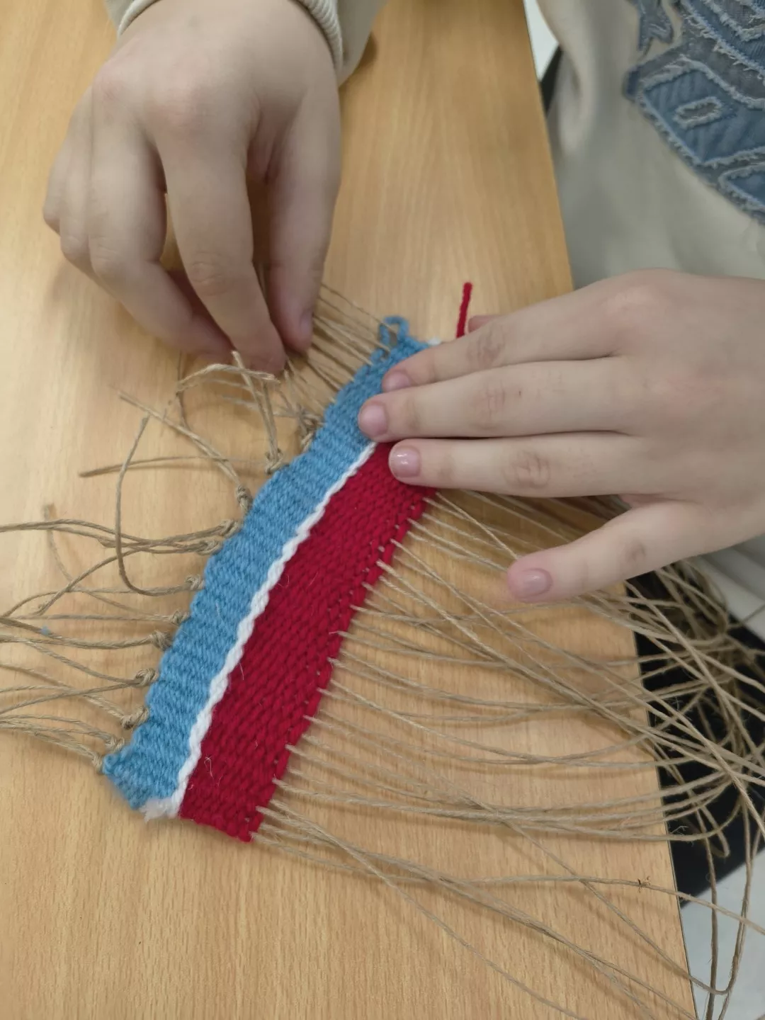 Podczas zajęć rozwijających uzdolnienia artystyczne w kl. 7a uczniowie mogli spróbować swoich sił w tkactwie własnoręcznie wykonując małą tkaninę. Zadanie wymagało skupienia, by nie przeoczyć żadnej nitki osnowy i utrzymać rytm biegnącego wątku. Nie było to łatwe. I pomyśleć, że nasze babcie i prababcie potrafiły utkać na wielkim krośnie tkackim długie chodniki oraz gęste lniane płótno, z którego później szyto np. koszule...