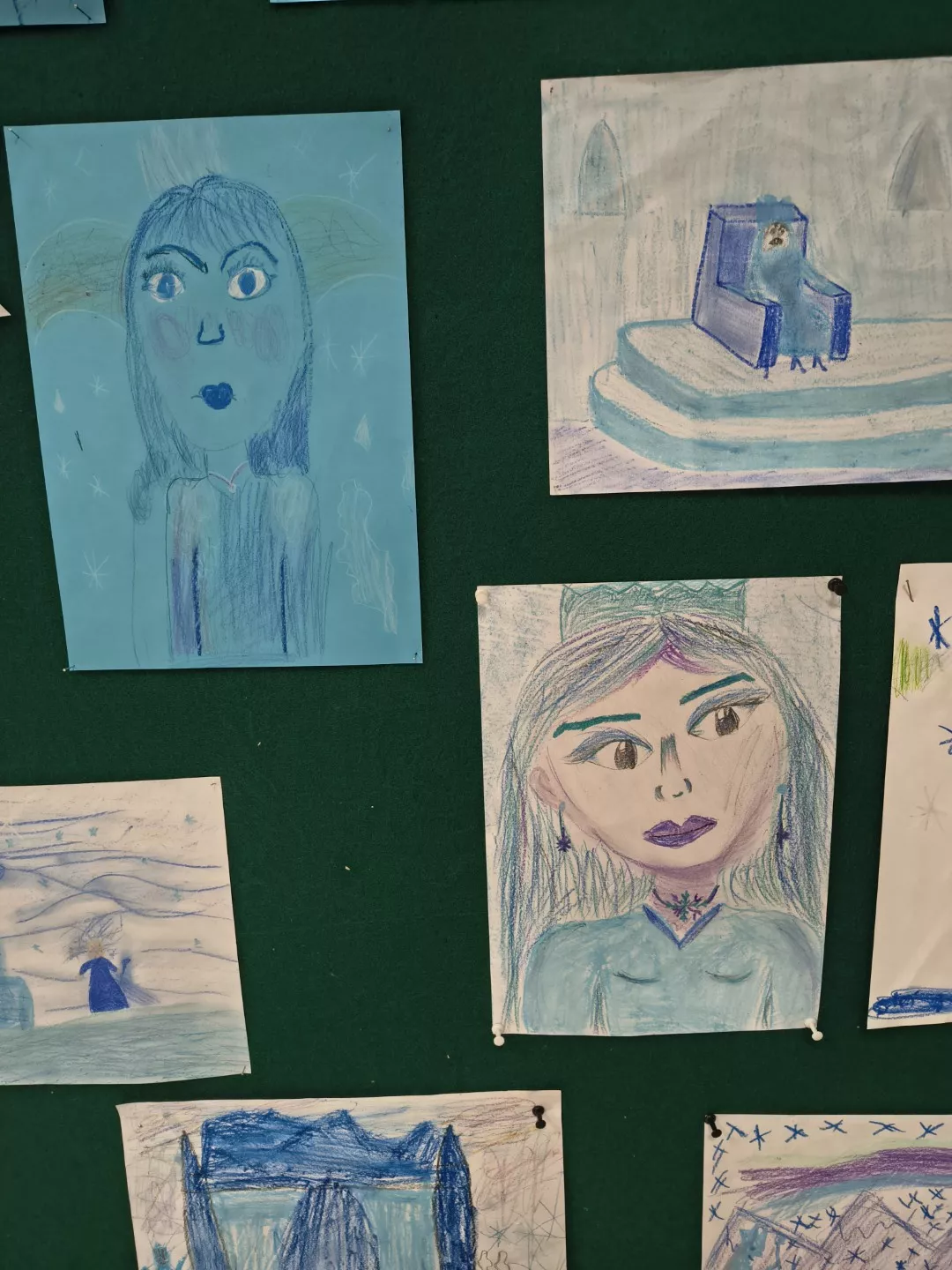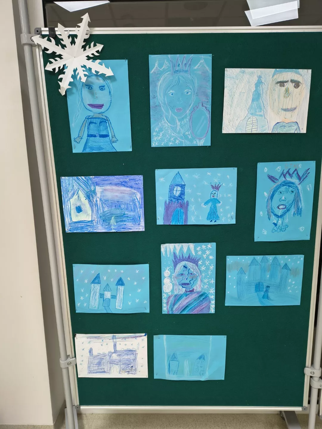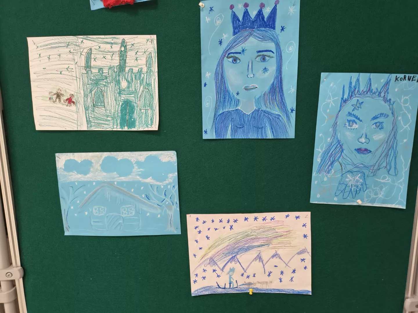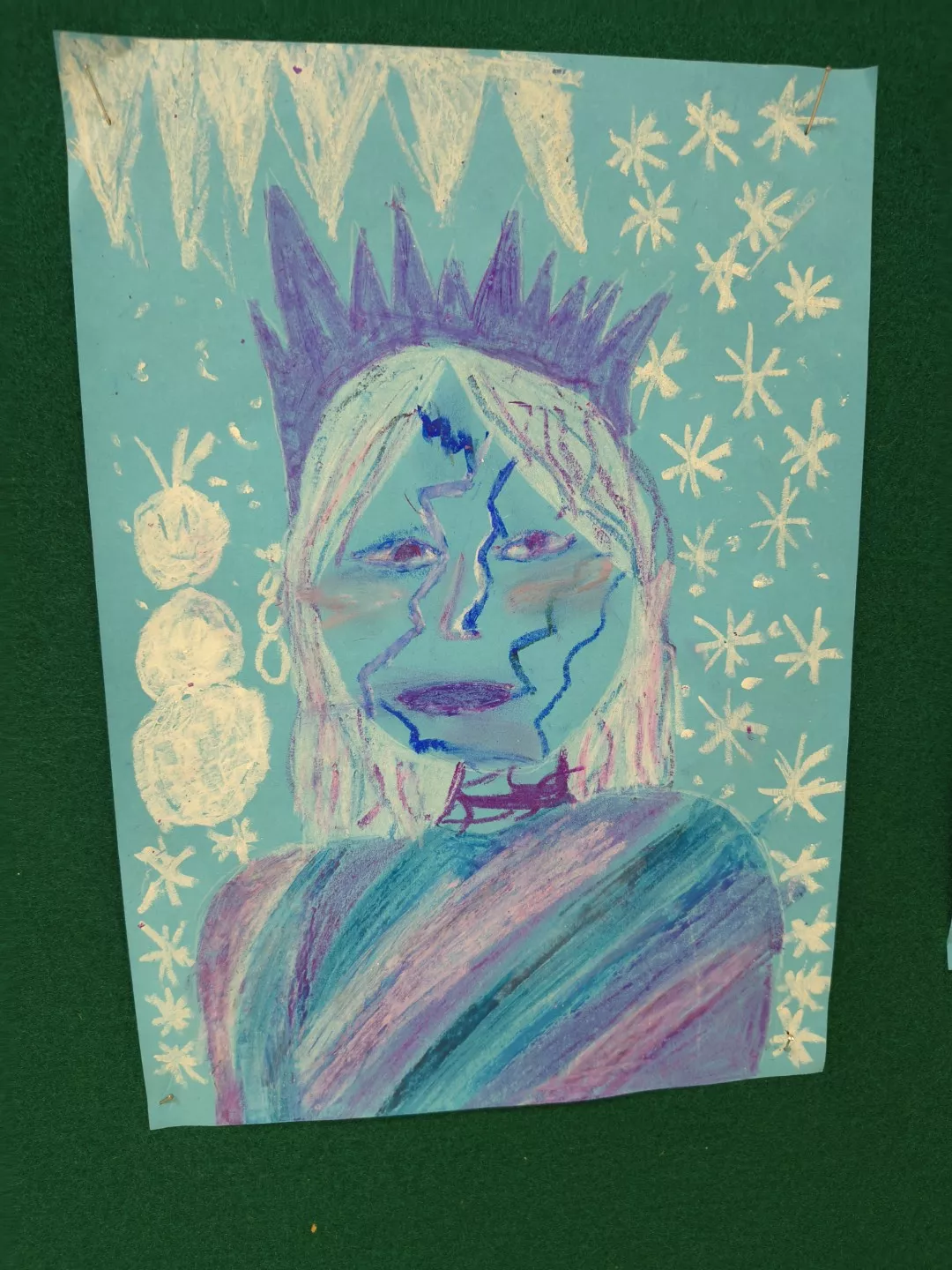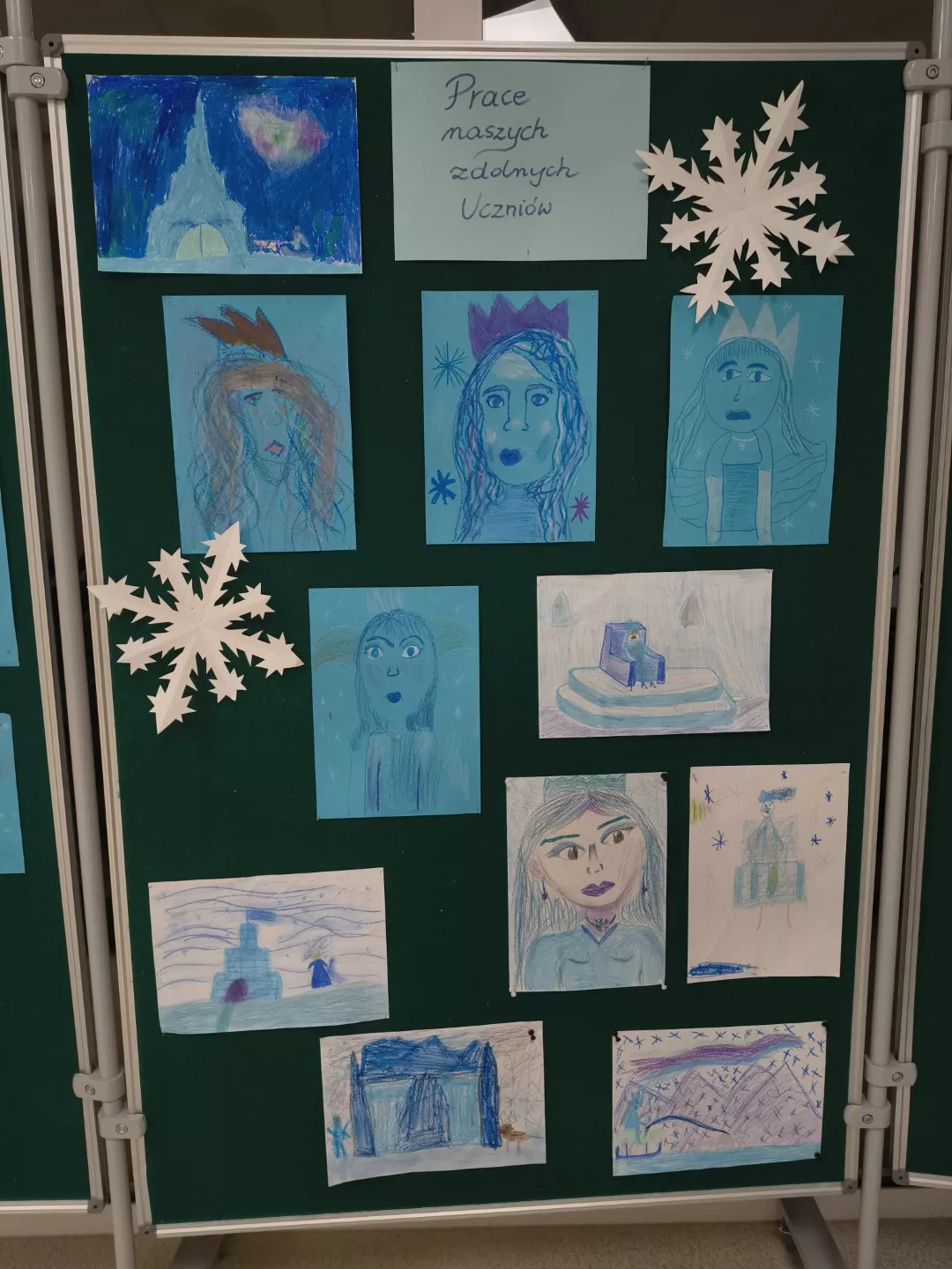 Tym razem uczniowie uczęszczający na zajęcia świetlicowe inspirując się światem fantazji i sztuką surrealizmu wykonali zadanie nr 16 -"ulubiona postać z literatury"- Królowa Śniegu, która, miejmy nadzieję, przybędzie do nas na święta Bożego Narodzenia, by otulić świat białym puchem.