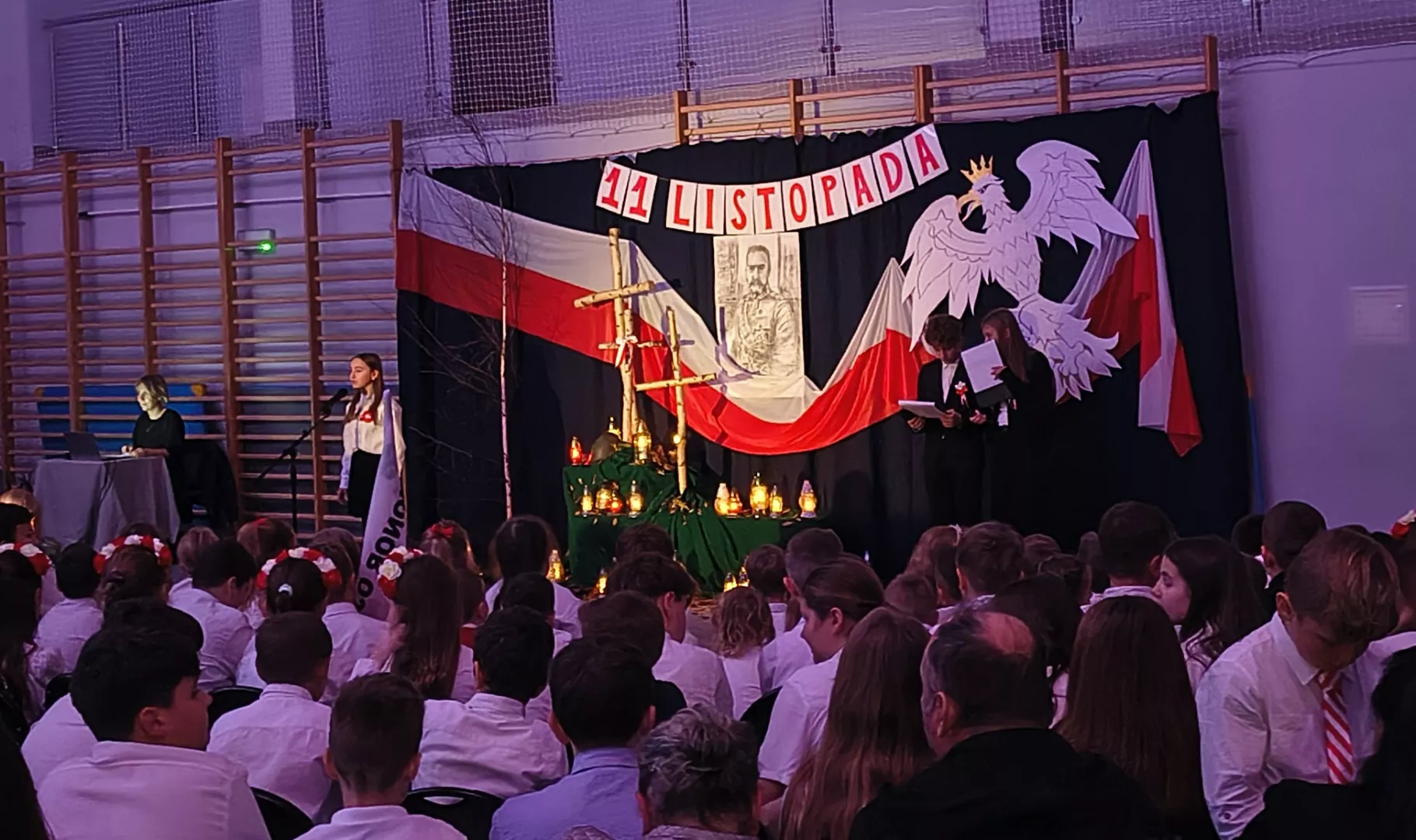 Podczas wieczornicy wszyscy zgromadzeni– uczniowie, goście i nauczyciele – wspólnie śpiewali patriotyczne pieśni, tworząc atmosferę jedności i dumy narodowej.