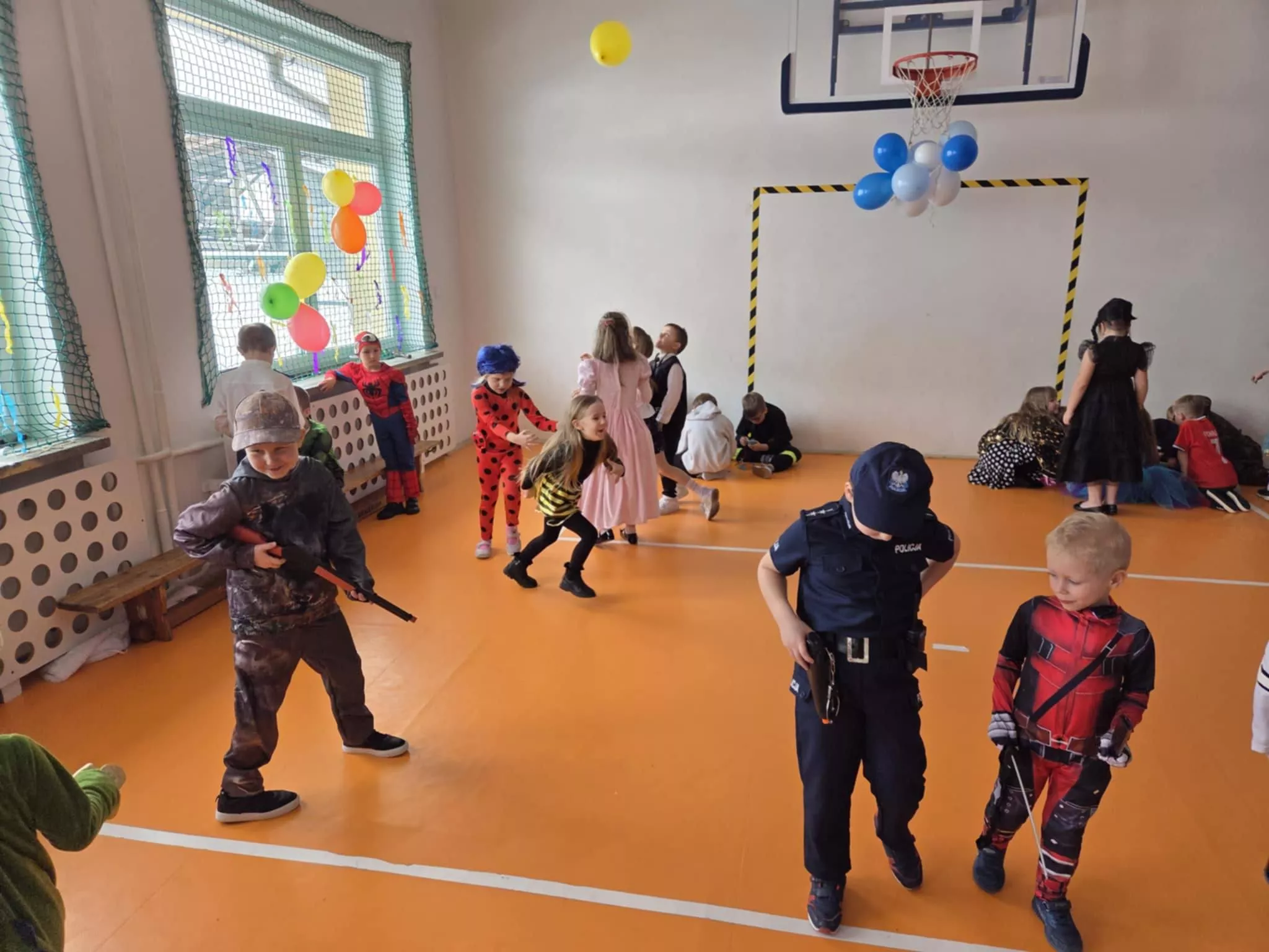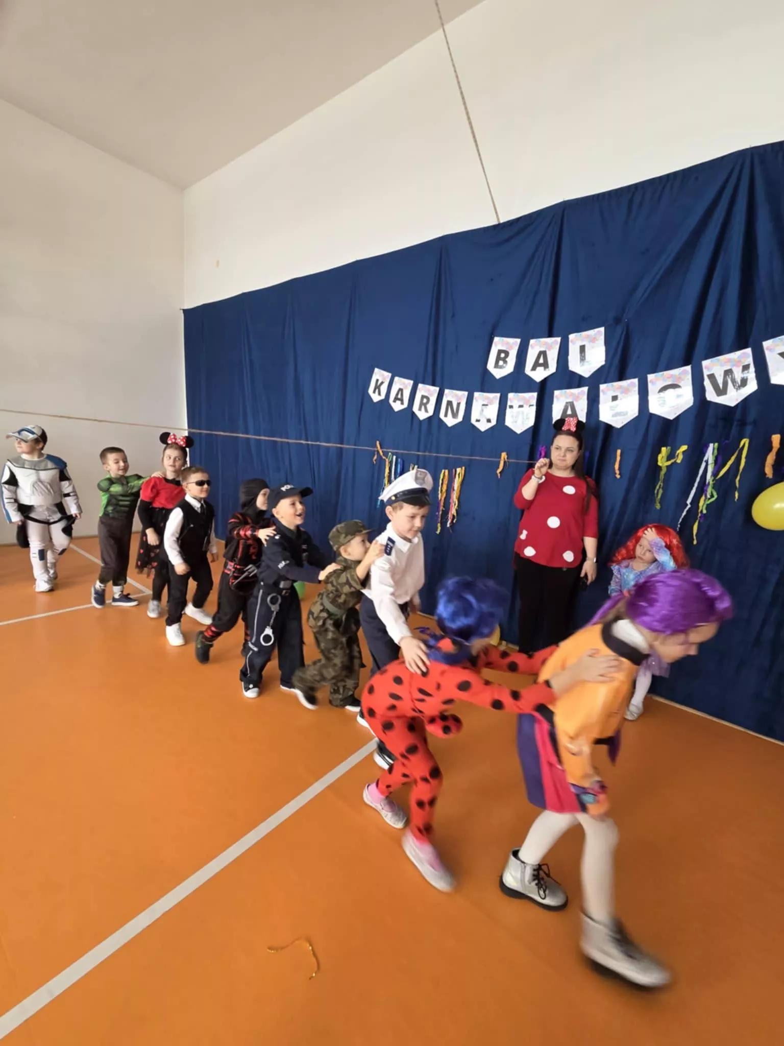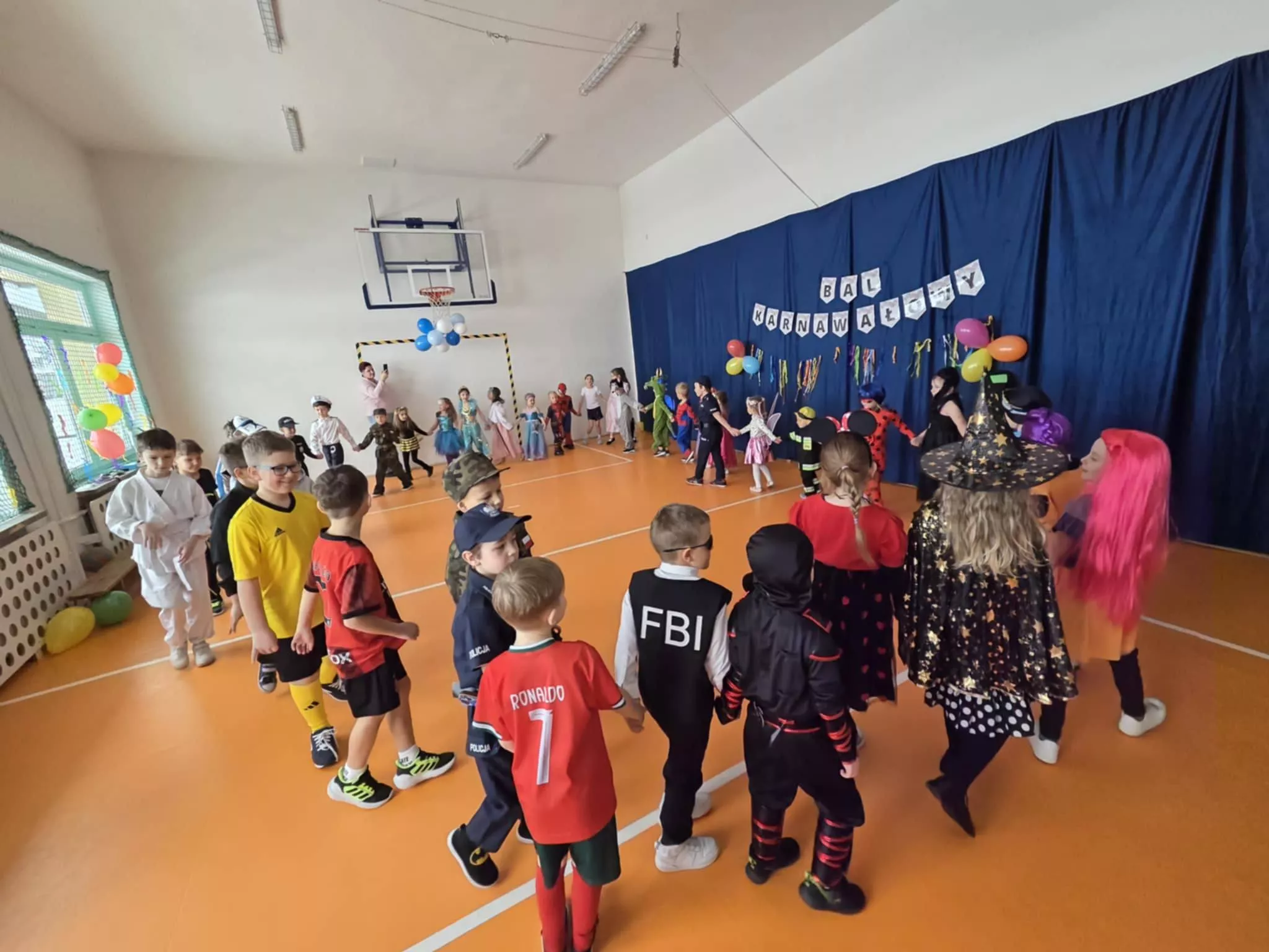 Sala gimnastyczna zamieniła się w prawdziwą krainę tańca, muzyki i kolorowych strojów. Dzieci z ogromnym zaangażowaniem prezentowały swoje przebrania – nie zabrakło księżniczek, superbohaterów, zwierzątek oraz wielu innych fantastycznych postaci. Wspólne tańce, konkursy i zabawy ruchowe dostarczyły wszystkim mnóstwo radości i uśmiechu.